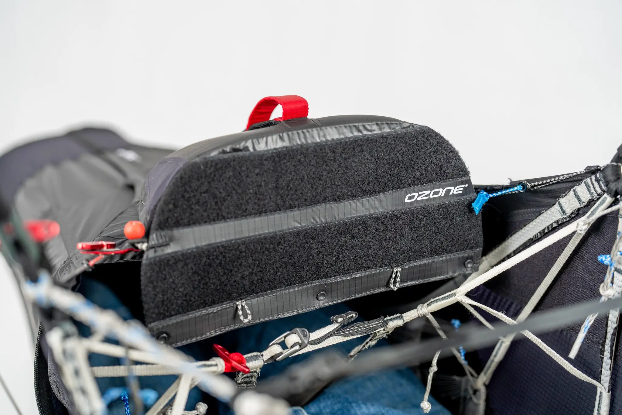 A new inflatable protection system features an innovative inner compartmented design which is more efficient. It is also quick to setup – during a hike & fly race, every second counts, and a new 50 gram pump provides rapid inflation. The protector can also be inflated using the bag which comes standard. A dump valve allows rapid deflation. An inflation tube is accessible in-flight.